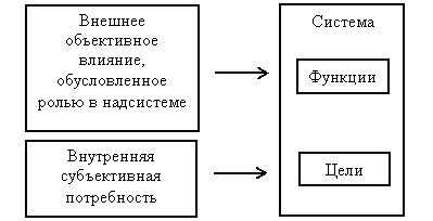 Если функция отражает роль системы в надсистеме и объективно обусловливается ею, то цель выражает внутренние потребности системы. Поэтому отождествлять цель и функцию нельзя. Но можно утверждать, что они могут, как способствовать, так и препятствовать осуществлению друг друга (противоречить).