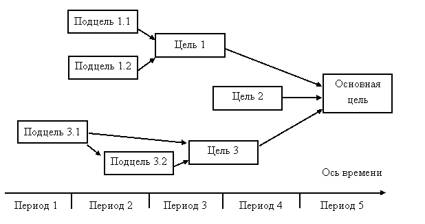 б) Временная декомпозиция связана с прогнозированием достижения цели и разнесением подцелей во времени (рис.12).
