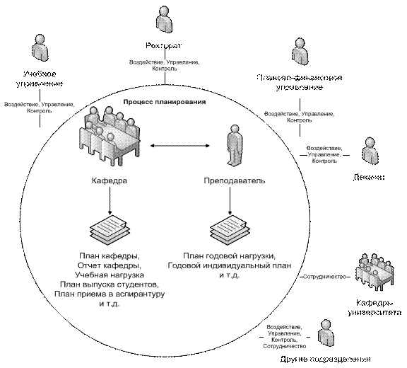 Планирование учебного процесса состоит в создании условий для учебного процесса, т. е. планировании учебной нагрузки, загрузки учебных лабораторий, выпуска (переработки) учебно-методической литературы и распределении других ресурсов. Система планирования учебного процесса гораздо шире границ кафедры и включает целый ряд подразделений вуза, выступающих в роли её элементов (рис.13). С другой стороны, сама система является элементом системы управления вузом и может рассматриваться только в её контексте.