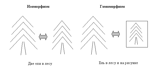 1) Изоморфизм подразумевает одинаковость структуры систем. При этом различный смысл системообразующих отношений и различие элементов системы при их сопоставлении не учитываются. Две системы изоморфны, если между ними установлено такое взаимнооднозначное соответствие, что соответствующие друг другу объекты обладают соответствующими свойствами и находятся (внутри каждой системы) в соответствующих отношениях между собой. Две ели в лесу изоморфны (рис.31).