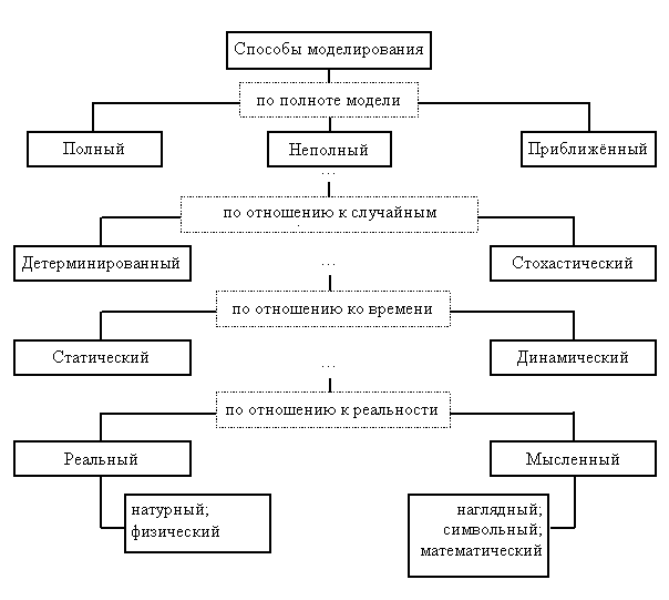 По полноте способы моделирования делятся на: полный, неполный и приближенный. При полном способе моделирования модели изоморфны (идентичны) объекту во времени и пространстве. Для неполного способа моделирования эта идентичность не сохраняется. В основе приближенного способа моделирования лежит подобие, при котором некоторые стороны реального объекта не моделируются совсем (гомоморфизм). Поскольку абсолютное подобие возможно лишь при замене одного объекта другим точно таким же, то при моделировании абсолютное подобие не имеет места. Исследователи стремятся к тому, чтобы модель хорошо отображала только исследуемый аспект системы.