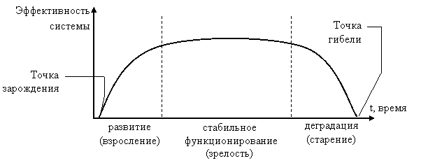 9) Принцип развития указывает на свойство изменчивости систем со временем. Такие изменения могут происходить в сторону улучшения показателей эффективности системы. В этом случае система называется развивающейся. Если же изменение показателей системы происходит в сторону ухудшения, то её называют деградирующей. Любые системы обладают жизненным циклом, в ходе которого они зарождаются, развиваются, деградируют и разрушаются (рис.69). Для систем свойственен этап стабильного функционирования, когда процессы развития и деградации уравновешиваются.