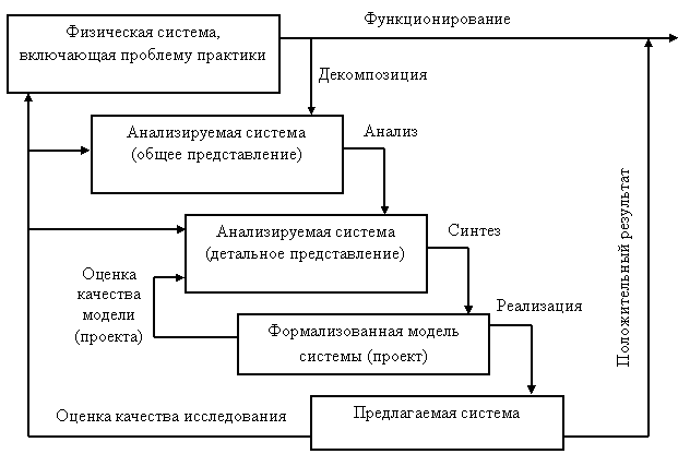 В результате синтеза формируется формализованная модель системы, с помощью которой осуществляется аспектная оценка анализируемой системы. Если проверка проходит успешно, то формализованная модель становится проектом новой предлагаемой системы, в которой задача практики предполагается решенной. Реализация проекта предлагаемой системы позволяет провести оценку степени снятия проблемы практики и принять решение об успешном окончании системного исследования, об уточнении модели системы или, в худшем случае, о повторении системного исследования в другом аспекте.