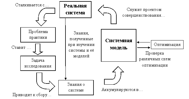 Такой подход позволяет сформировать вектор исследования, направленный на всестороннее изучение реальной проблемы и обобщение результатов этого изучения в виде особого формализованного представления – модели системы (или системной модели), представляющий собой и объект для дальнейшего изучения и проект будущей реальной системы одновременно (рис.80). Таким образом, вопрос формирования и исследования системной модели приобретает особый смысл. Важным аспектом этого подхода к системному анализу является возможность улучшения системы на основании экспериментов с системной моделью, поэтому он становится наиболее распространённым.
