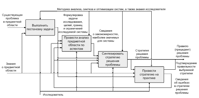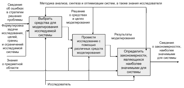На начальном уровне формируется семантическая мера «цель исследования», очерчивающая только необходимый исследователю круг задач. Затем определяется новая семантическая мера «точка зрения», которая позволяет решать задачи исследования с позиций тех или иных действующих лиц. Для познания закономерностей, действующих в исследуемой системе, используются различные методы моделирования. Результаты моделирования аккумулируются в общую модель, представляющую систему в удобном для исследователя виде, дальнейшее изучение которой позволяет познать саму систему.