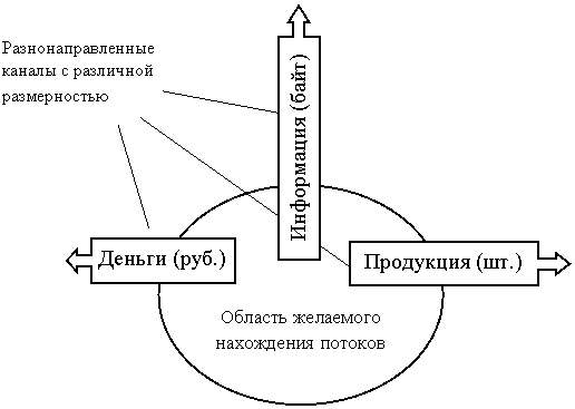 Проблема оценки связей в системе. В экономических системах принято выделять три типа связей с внешней средой: продукция, деньги, информация. При постановке задачи возникает проблема согласования этих несопоставимых по размерностям показателей, поскольку без такого согласования невозможно установить единый показатель эффективности системы в целом (рис.86).