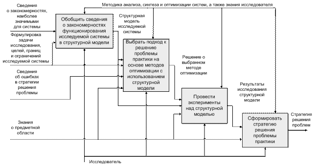 Для изучения накопленной информации о функционировании системы требуется формы представления и хранения этой информации. Современный системный анализ предлагает множество методик синтеза знаний в виде различных интегральных моделей. Для организованных систем, к числу которых относятся все виды организаций, коллективов, команд и групп наибольшие возможности для создания корректной системной модели предоставляет методология SADT.