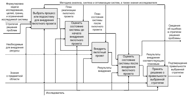 Для проверки любых оптимизационных стратегий на практике необходимо сначала реализовать их. Однако полномасштабная реализация даже самой привлекательной и продуманной стратегии обычно сопряжена с большими рисками, поэтому обычно проверку проводят на одном из процессов или даже подпроцессов, а затем принимают решение о реализации стратегии преобразования во всей организованной системе. Такой подход называют реализацией пилотного проекта.