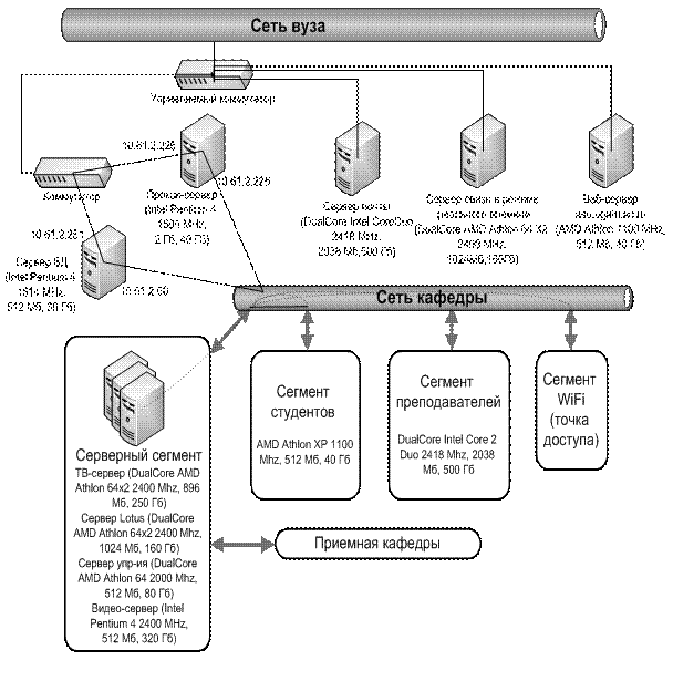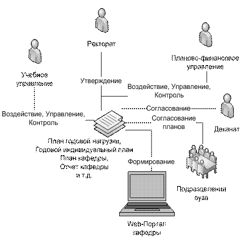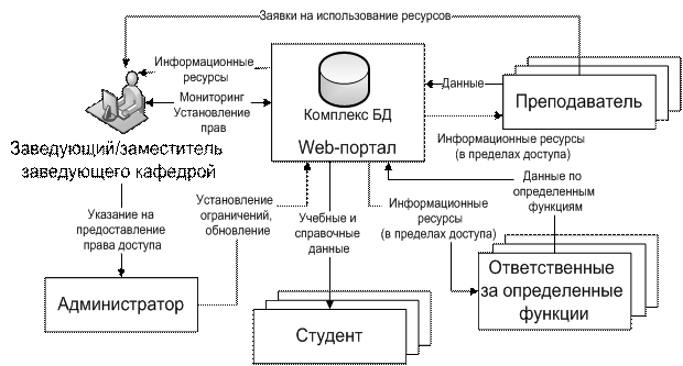 На конечном этапе можно предложить следующую схему информационной системы управления кафедрой с использованием web-портала (рис.96):