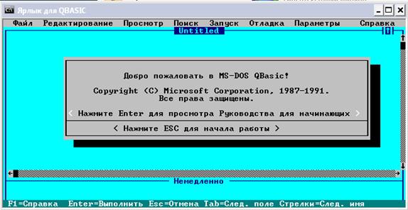 Теперь возникает вопрос: где мы должны набирать текст наших программ? Для этого существует программная среда QBasic (то есть это специальная программа, в которой можно набирать, редактировать текст программ и видеть результат их выполнения). Окно этой программы выглядит следующим образом:
