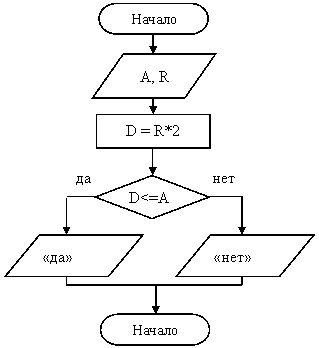 8. Определить поместится ли круг с радиусом R в квадрате со стороной A?