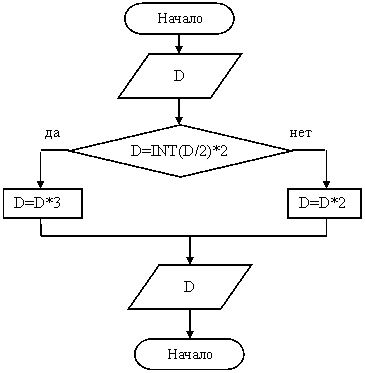 3. Дано число D, если оно четное, то увеличить его в три раза, иначе увеличить его в два раза.
