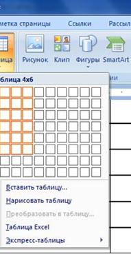 Для того чтобы быстро вставить таблицу, например таблицу 4х6, необходимо в области Вставка таблицы (рисунок 10) выделить нужное количество столбцов (4) и строк (6), и щелкнуть левой клавишей мыши на выделенной области.