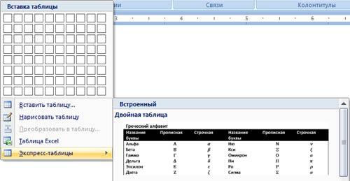 Вставка таблицы из коллекции с помощью окна диалога "Встроенный". Для этого после щелчка на пункте Экспресс-таблицы (рисунок 12) нужно выбрать в окне диалога "Встроенный" требуемый шаблон (стиль) таблицы.