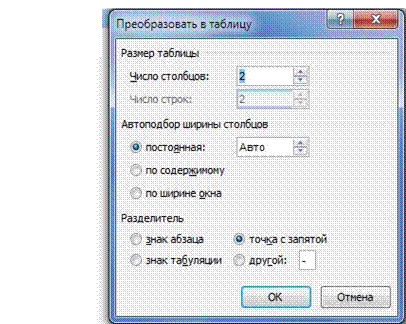 Например, в приведенном списке с двумя словами и строками в качестве разделителей вставлены точки с запятыми, чтобы выполнить создание таблицы с двумя столбцами и строками. Скриншот окна диалога создания таблицы из текста представлен на рисунке 14.