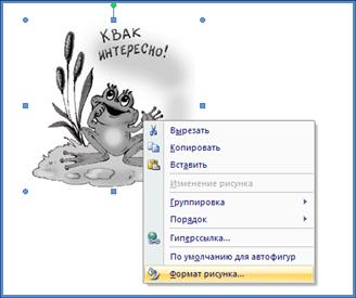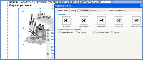 Вставка рисунков производится из меню Вставка – Рисунок – из файла. Работать с рисунками удобно также используя контекстное меню - Формат рисунка.