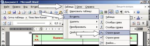 . В открывшемся меню установите указатель мыши на строку «Вставить». Выберите соответствующую команду («Строки ниже» или «Строки выше») и нажмите левую кнопку мыши.