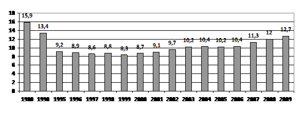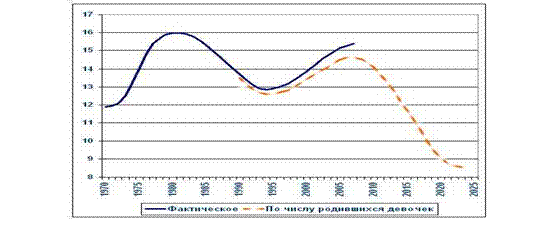 Следует отметить, что некоторый рост рождаемости, отмеченный в последний год, вызван благоприятной возрастно-половой структурой населения, то есть увеличением количества женщин детородного возраста. Однако период роста числа женщин в детородных возрастах заканчивается. Ряды потенциальных матерей будут пополняться малочисленными поколениями, родившимися в 90-е годы ХХ столетия. Произойдет резкий спад числа женщин в возрасте наибольшей плодовитости. Даже при заметном повышении рождаемости, если его удастся добиться, число потенциальных матерей не позволит родить столько детей, сколько нужно, чтобы число рождений превысило число смертей.