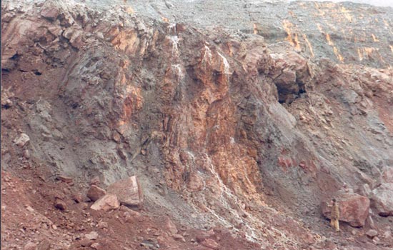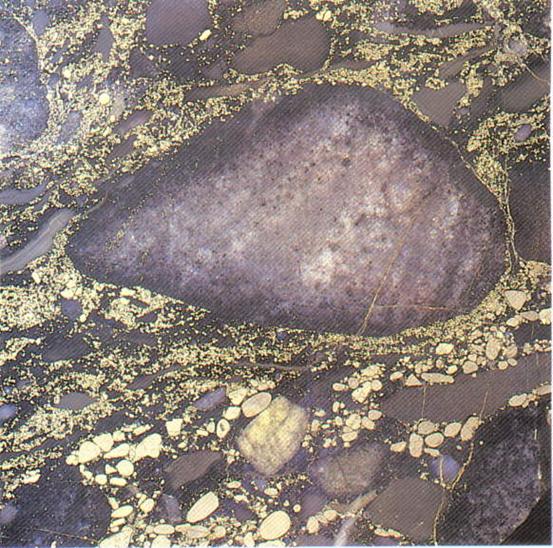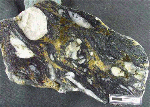 Cu ore breccia, Mosaboni Mine, Singhbhum Belt, Jharkhand State, India. Brittle partly rotated quartz fragments embedded in phyllonite with chalcopyrite stringers. PL 1983, 2008; Mosaboni sample is from D. Kirwin’s collection. Scale bars 1 & 2 cm, respectively.