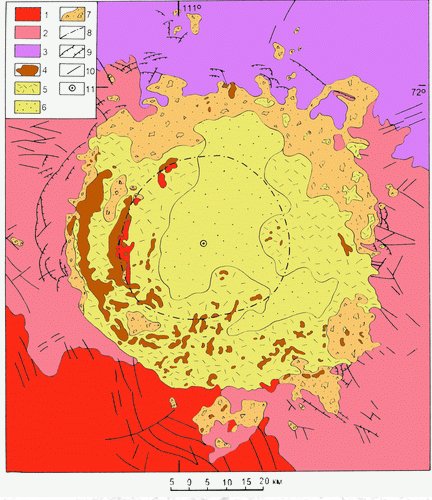 Схема геологического строения Попигайского кратера по [9] 1 - кристаллические породы верхнеанабарской и хапчанской серий архея; 2 - осадочные породы верхнего протерозоя и нижнего палеозоя; 3 - осадочные и вулканогенно-осадочный породы верхнего палеозоя и мезозоя; 4 - тагамиты; 5 - зювиты; 6 - псаммито-алевритовые брекчии; 7 - аллогенные брекчии; 8 - гребень кольцевого поднятия; 9 - надвиги и сбросы; 10 - разрывные нарушения не установленной морфологии; 11 - центр кратера. По Масайтису и др., [1980, 1998]