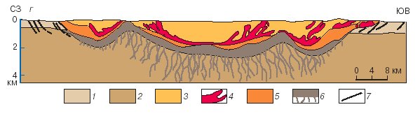 1 - породы чехла Сибирской платформы; 2 - породы кристаллического фундамента Сибирской платформы; 3 - зювиты; 4 - тагамиты; 5 - аллогенные брекчии; 6 - аутигенные брекчии, переходящие в подкратерную зону трещиноватости; 7 - разрывные нарушения; ( Астроблемы – звездные раны Земли. Соросовский образовательный журнал. 1999. №9. С.67-74.)