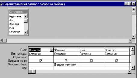 o В столбце Фамилия в строке Условие отбора ввести в квадратных скобках [Введите фамилию] (сообщение, которое будет выводиться на экран при выполнении запроса).