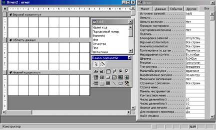 Дополнительно можно вывести окно свойств создаваемого отчета (Вид -> Свойства) или выполнив щелчок по пиктограмме Свойства.