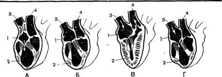 желудочка, Г—пауза, /—предсердие 2 — желудочек, 3—вена 4 — аорта