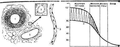 Рис. 63 Стенки артерий (/), вен (2), капилляров (3).