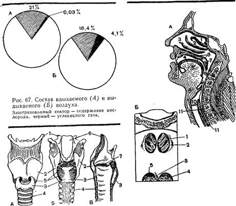 Значение дыхания. Дыханием называется обмен газов Mf^.ny '•'р^ччямпм и окружающей средой. ^ человека, как и у всех млекопитающих, этот обмен осуществляется специальными орга--нами дыхания ——дагкими. Через легкие организм получает кислород из вдыхаемого воздуха и отдает в него углекислый газ. В этим нетрудно" убедиться, если сравнить состав вдыхаемого, т. е. атмосферного, воздуха с выдыхаемым (рис. 67). В атмосферном воздухе содержание кислорода ппхопит^ло 21 %. а количество углекислого газа не превышает сотых долей процента. В выдыхаемом воздухе количество кислорода снижается до 16%, но зато резко увеличивается содержание углекислого газа, достигая 4—4,5%.