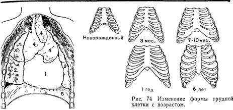 За тот же период жизни (от 1 до 7 лет) существенно меняется форма грудной клетки. Увеличивается наклон ребер, особенно нижних. Ребра тянут за собой грудину, которая не только растет в длину, но и опускается книзу, причем уменьшается выпячивание ее нижнего конца. В связи с этим окружность нижней части грудной клетки увеличивается несколько медленнее и к 2—3 годам становится такой же, как и окружность ее верхней части (при измерении под мышками). В последующие годы верхняя окружность начинает превышать нижнюю (к 7 годам примерно на 2 см).