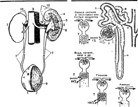 / — клубочки капилляров; 2 — полость капсулы; 3 — начальная извитая часть каналь-ца; 4 — прямая часть канальца; 5 — конечная извитая часть канальца; 6 -— соединительная трубка; 7—примеры обратного всасывания и выделения различных веществ в канальцы.