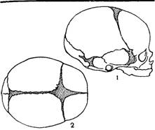 У новорожденного плоские кости мозгового черепа еще не на всем протяжении соприкасаются друг с другом. Особенно велик промежуток между\ лобной и теменными ростями — так называемый лобный, или большой, родничок, (рис! 13). Он постепенно зарастает в первые годы жизни; как правило, к началу второго года он почти не прощупывается. Промежуток между Ьатылочной и дву-мя теменны ми костя ми (малый родничок) зарастает в течедйе-нер-вых^месяцев^жйзни ребенка, а чаще уже к его появлению на свет.
