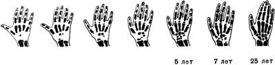 Развитие скелета после рождения. После рождения скелет продолжает расти и развиваться. Появляются новые центры окостенения. Сроки их появления у здоровых детей довольно постоянны, что дает возможность в нужных случаях устанавливать возраст ребенка по рентгеновским снимкам определенных частей скелета (рис. 14).