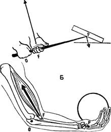 О—точка опоры, F—точка приложения силы (место прикрепления мышцы); Р — точка приложения противодействия Для сравнения показана схема поднятия крышки палкой при подобном же расположении