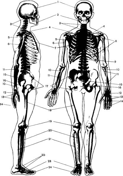 /—череп, 2—нижняя челюсть, 3 — шейные позвонки, 4 — ключица, 5 — лопатка 6 — плечевая кость, 7 — грудная кость, 8 — ребра, 9 — поясничные позвонки 10 — лучевая кость, л—локтевая кость, и—запястье, И—пясть, 14 — кости пальцев, IS — крестец 16 — коп-чик, 17 — тазовые кости, и—бедро, 19 — коленная чашечка, 20 — большая берцовая кость 21 — малая берцовая кость, 22 — предплюсна, 23— плюсна, 24 — кости пальцев ноги