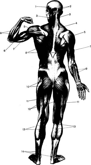 /—височная; 2 — затылочная; 3 — шейные (участвуют в движениях головы); 4 — трапеце-видная (оттягивает лопатку к позвоночнику); 5 — дельтовидная; 6 — двухглавая; 7 — трехглавая; 8—широкая спины (поворачивает руку внутрь и отводит ее назад); 9—разгибатели кисти и пальцев; 10—большая ягодичная (поворачивает бедро наружу); //—двухглавая бедра (сгибает ногу в колене); 12 — полусухожильная (разгибает ногу в тазобедренном суставе, сгибает в коленном и вращает голень внутрь); 13 — икроножная; 14 — ахил-лово сухожилие.