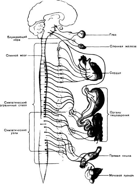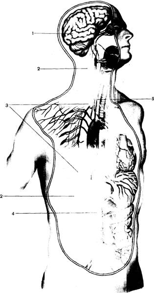 7 — головной мозг; 2—спинной мозг; 3— пограничный ствол симпатической системы;