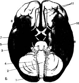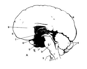 А—правая половина мозга (вход с внутренней стороны), Б—нижняя поверхность мозга, /—верхний участок спинного мозга, 2—продолговатый мозг 3— мост 4—мозжечок, 5 — средний мозг, 6 — четверохолмие, 7 — промежуточный мозг, 8 — кора больших полуша рий, Я — мозолистое тело, соединяющее правое полушарие с левым, /О—перекрест зри тельных нервов, // — обонятельные луковицы