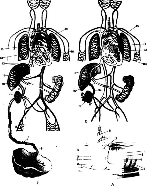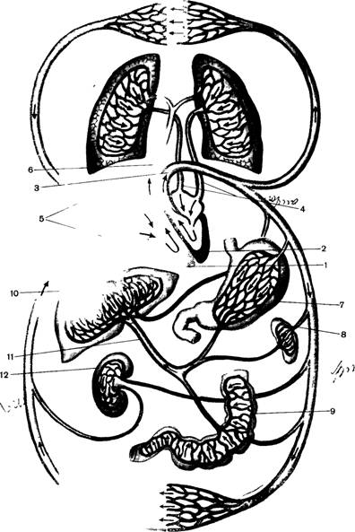 г—левая половина сердца: а—аорта; 4— легочные вены; 5 — верхняя и нижняя полые вены; в—легочная артерия; 7 — желудок; в—селезенка; 9 — кишки; /О—печень; Л — воротная вена; !2 — почка.
