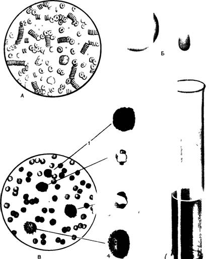 А — кровь под микроскопом видны три лейкоцита среди большого количества эритроцитов, Б — эритроцит, В — окрашенный препарат крови / — лимфоцит 2 — нейтрофил, 3 — эозино фил 4 — базофил Г — предохраненная от свертывания кровь после длительного отстаива ния между верхним слоем (плазмой) и нижним слоем (эритроцитами) виден тонкий слой лейкоцитов
