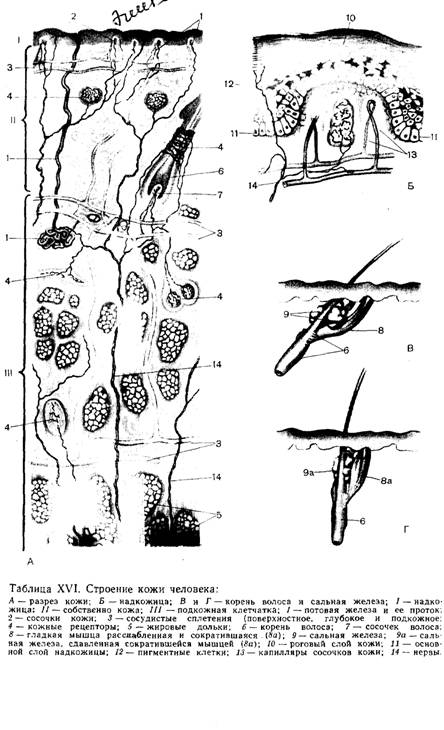 Таблица VII Локализация функций в коре больших полушарий А — наружная поверхность левого полушария, Б — внутренняя поверхнос шария / — двигательный центр, 2 — центры кожной чувствитечьности ) 4 — центры слуха. 5 — центры обоняния и вкуса, заштрихован»] it ut и течьный (б), слуховой (7), зрительный (в)