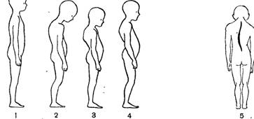 ;—нормальная; 2— сутулая; 3 — кифотическая; S — лордотическая; 5 — сколиоз.