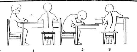 Высота стола над сиденьем, или дифференция, должна позволять ребенку свободно, без поднимания или опускания плеч, класть предплечья на крышку стола. При слишком большой дифференции ребенок, работая за столом, поднимает плечи, особенно правое, при слишком малой—он сгибается, сутулится (рис. 22).