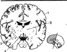 Рис 27 Серое и белое вещество на поперечном разрезе головного мозга / — кора больших полушарий 2 — подкор ковые двигательные ядра, 3 — бугры промежуточного мозга 4 — подбугровая область, справа — схема разреза