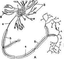 / — тело нейрона, 2 — ядро, S — дендриты. 4 — аксон, 5 — миелиновая оболочка