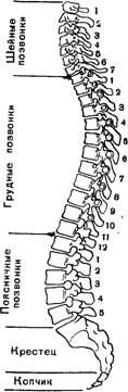 Позвоночник человека имеет шейный, грудной, поясничный и крестцовый изгибы (рис. 4), которые представляют собой отличительную особенность человека, связанную с вертикальным положением тела. Благодаря этим - изгибам центр тяжести тела стоящего человека переносится назад и находится на отвесной линии, проходящей между ступнями ног, ближе к пяткам. Такое положение центра тяжести обеспечивает сохранение равновесия и значительно облегчает ходьбу на двух ногах. Изгибы делают позвоночник более упругим и гибким. При ходьбе, беге, прыжках и всевозможных "резких движениях он пружинит и тем самым' предохраняет голову, а вместе'с ней и мозг от сптрягрний