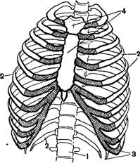 / — позвоночник; 2 — ребра; 3 — хрящевая часть ребер; 4 — грудина.