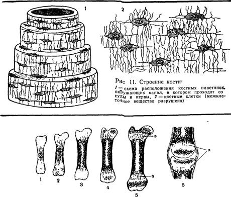 межклеточном веществе, обеспечивается тончайшими канальцами, густая сеть которых пронизывает ^сю кость. Костные клетки при помощи многочисленных длинных отростков, находящихся в ка-нальцах, соединяются друг с другом, что облегчает поступление необходимых веществ из тех клеток, которые находятся вблизи кровеносных сосудов (рис. 11, 2) Поэтому костные клетки, в отличие от хрящевых, могут оставаться жизнеспособными в течение многих лет.