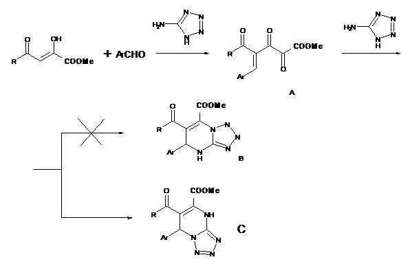 По-видимому, на первой стадии реакции образуется непредельное соединение А, с которым взаимодействует 5-аминотетразол с образованием соединений С. Изомерная структура В не образуется, по-видимому, вследствие меньшей термодинамической устойчивости 1,2-дигидропроизводных по сравнению с 1,4-дигидросоединениями С. Это подтверждает и тот факт, что в спектрах ЯМР1Н полученных веществ отсутствует расщепление сигналов протонов в положениях 1,2, характерное для АВ-системы в структуре В.